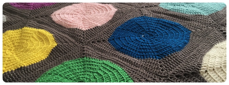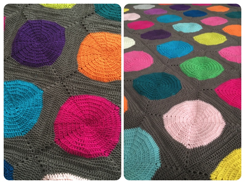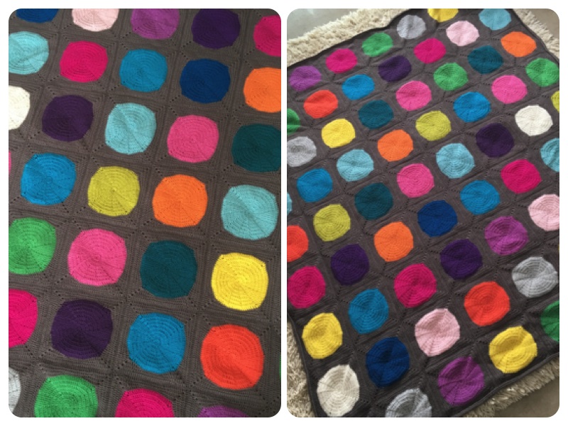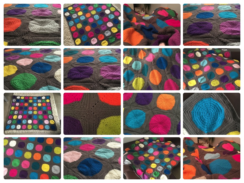 Und ja – sie ist mir nicht zu bunt. Nicht nur ich, auch der Rest der Familie fühlt sich richtig wohl unter dieser Decke. Im Nachhinein bin ich froh, dass ich keine kleineren Grannies hatte und auch nicht mehr Farbwechsel. Fäden vernähen ist wirklich nicht mein Ding 🙂 Davon mal abgesehen gefällt mir die „Großflächigkeit“ der Punkte auf dem einheitlichen Hintergrund. Ich bin mir aber auch sicher, dass dies nicht die letzte Häkeldecke war und wer weiß, was als nächstes kommt. Wie gesagt, bei Bella sind echte Meisterwerke zu bewundern!